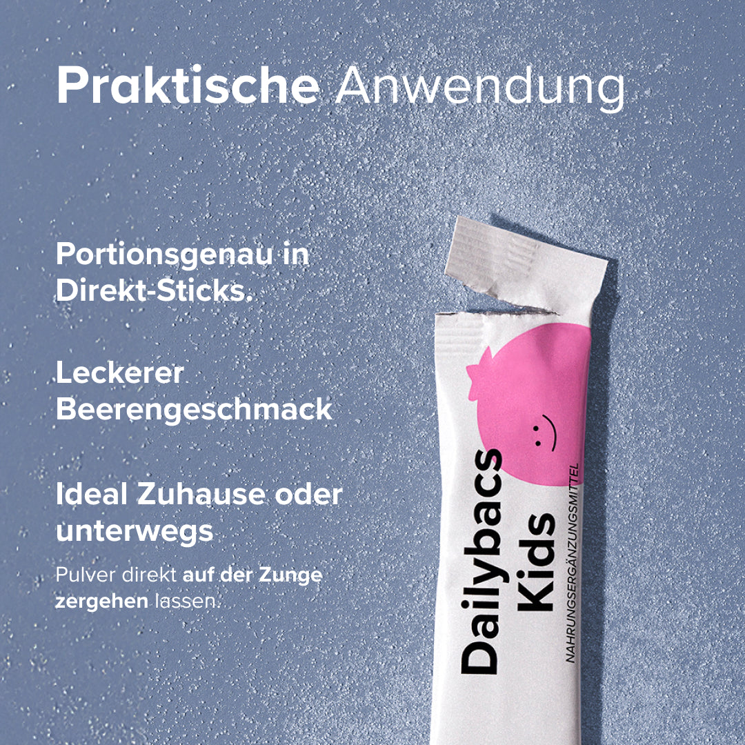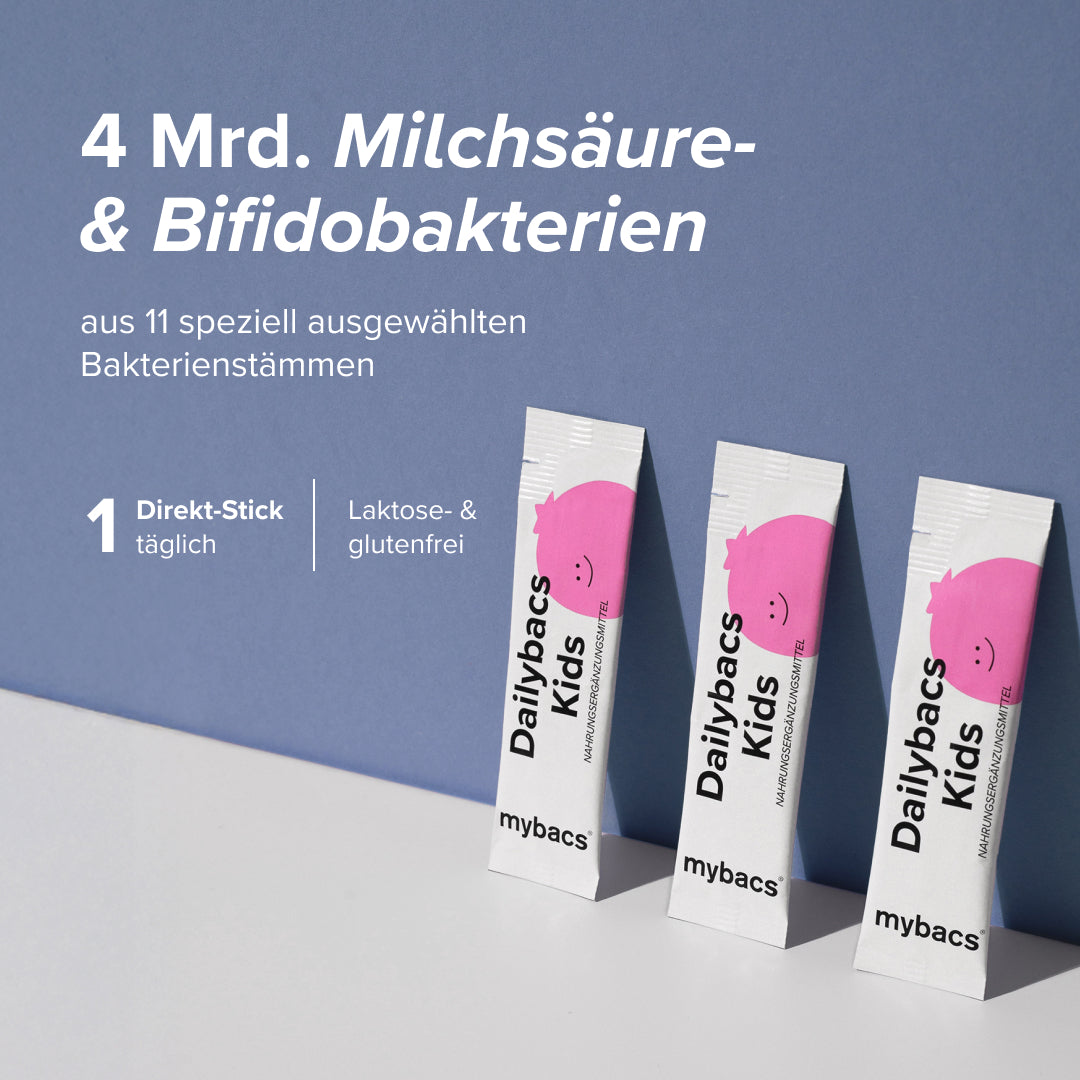 Dailybacs® Kids is a specially developed food supplement for children and adolescents aged 3 to 17 years. The practical powder form was specially developed for child-friendly consumption - simple and uncomplicated in just one sachet per day. The formula contains carefully selected live bacterial strains that are specifically tailored to the needs of this age group.