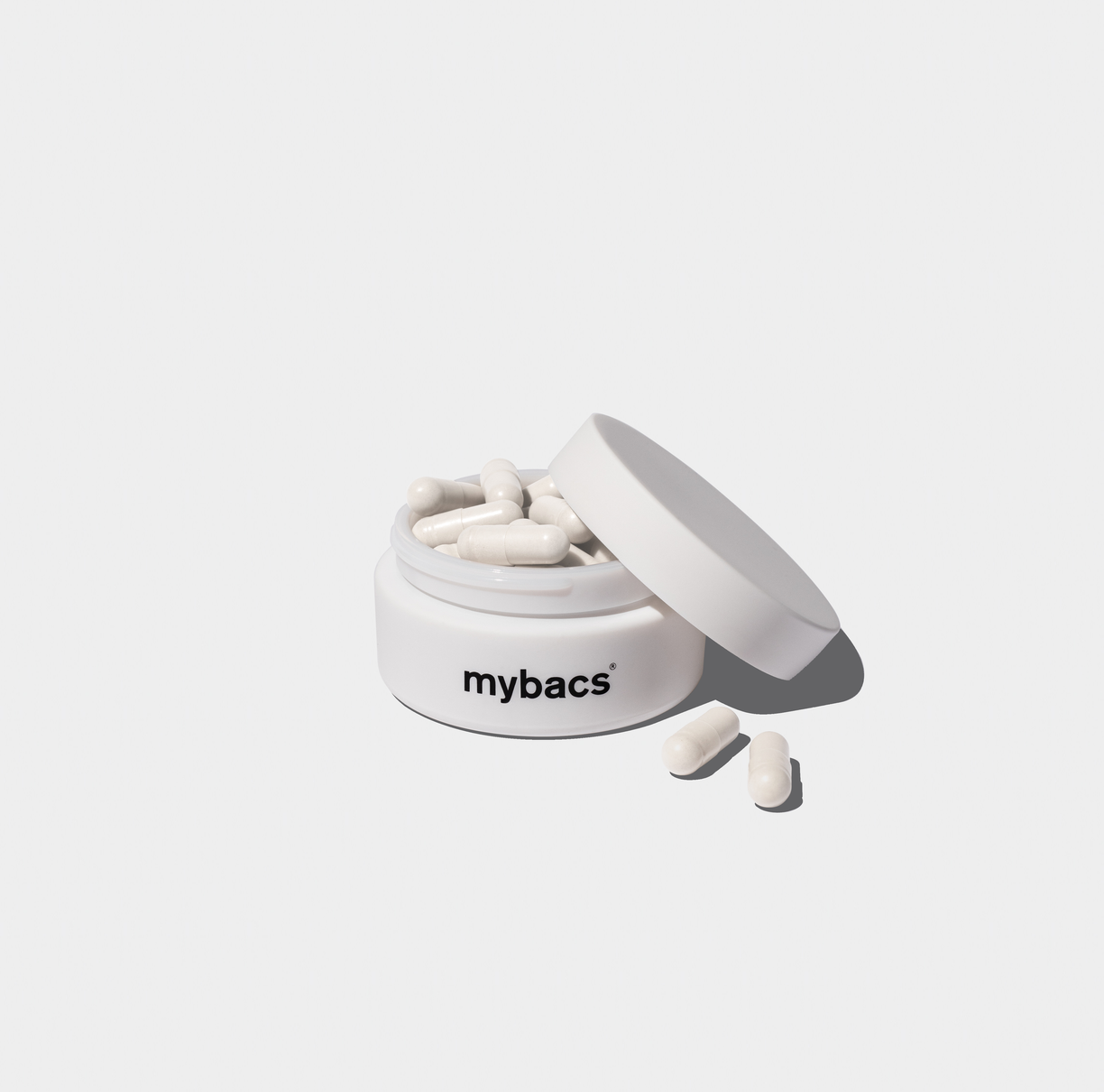 Das handliche Travel Jar bietet Platz für bis zu 30 deiner mybacs® Lieblingskapseln – perfekt für unterwegs!