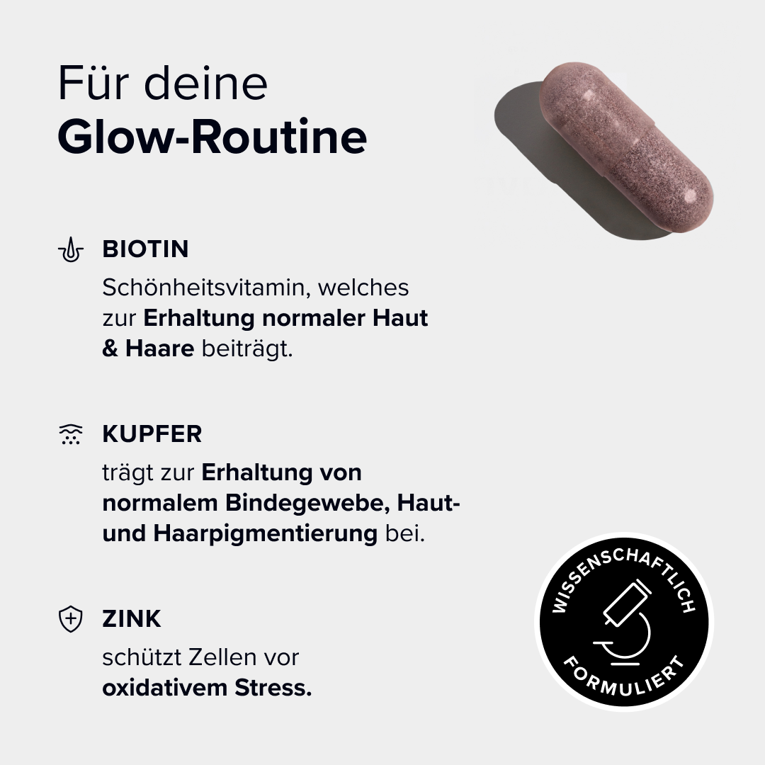 Mit einer Kapsel Radiant Glow kann jeder seine natürliche Beauty-Routine für Haut, Haare und Nägel unterstützen.¹'²'³'⁴'⁵ Radiant Glow enthält Hirse-, Heidelbeer- und Hyaluronsäure sowie Biotin, Selen und Zink, welches zur Erhaltung normaler Haut, Haare und Nägel beiträgt¹.