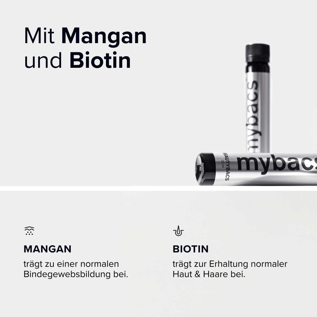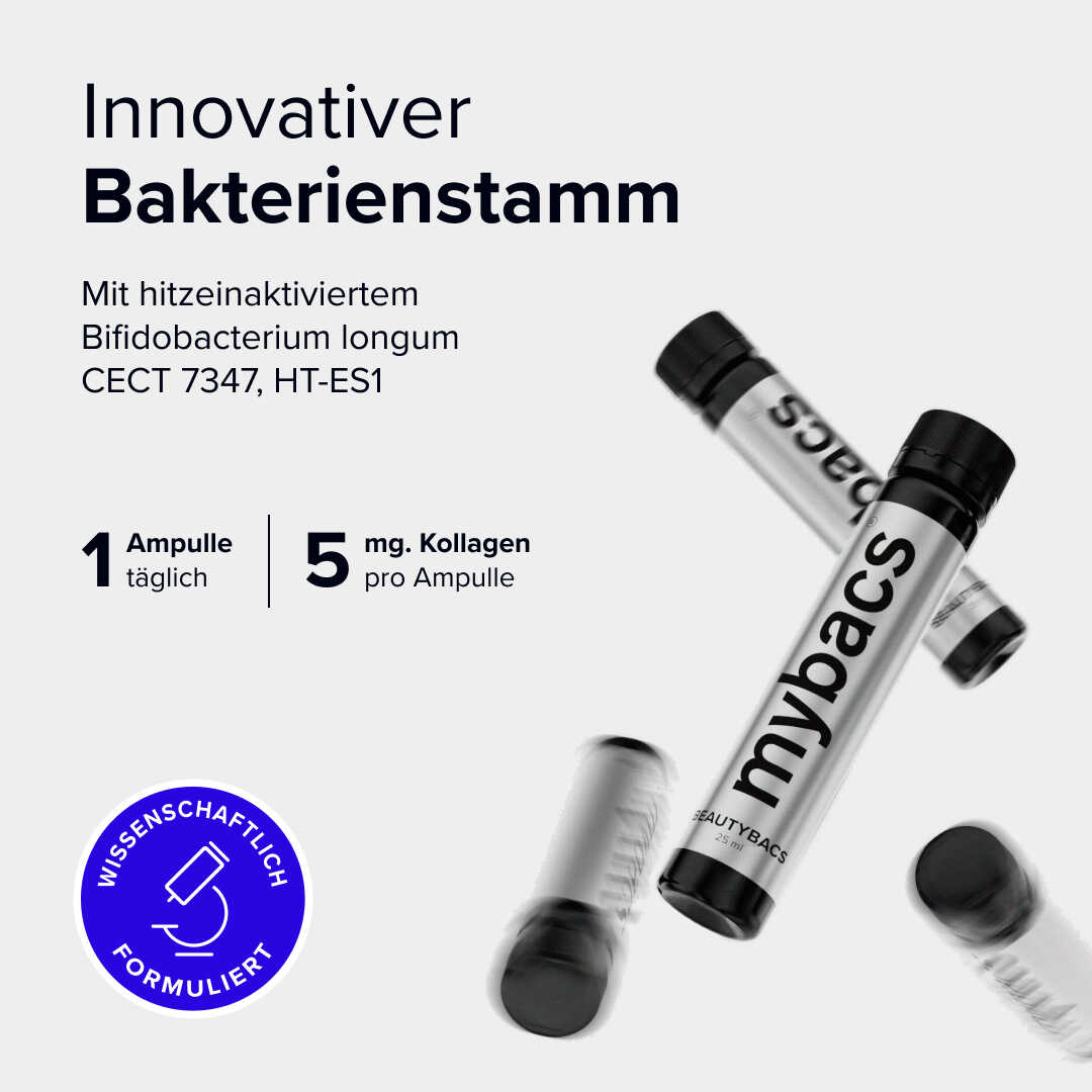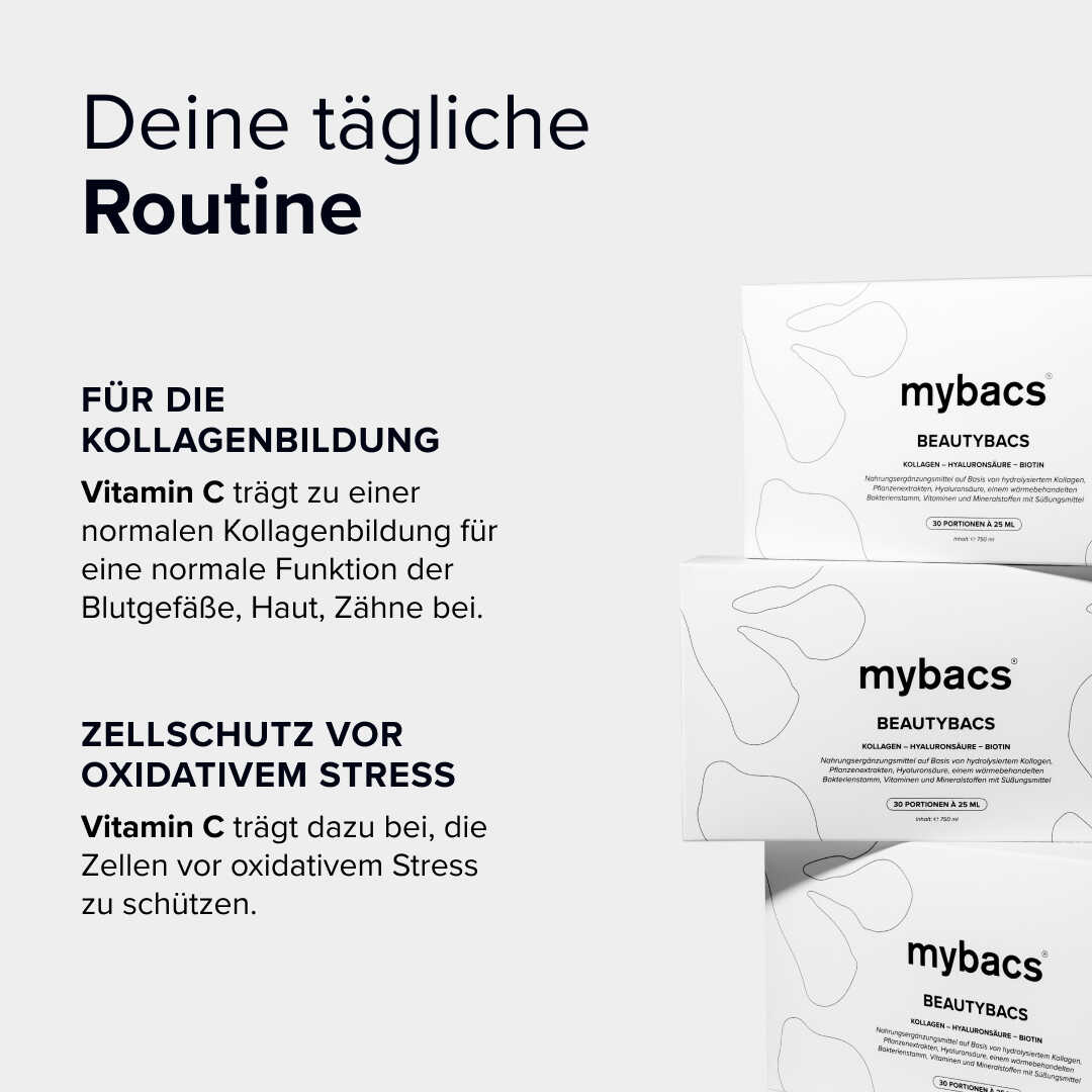 Die Beautybacs® enthalten alles für deine tägliche Beauty Routine: Sie vereinen Kollagen mit einem wärmebehandelten Bakterienstamm. Ergänzt durch Vitamine und Mineralstoffe, optimal formuliert für Haut, Haare und Nägel.