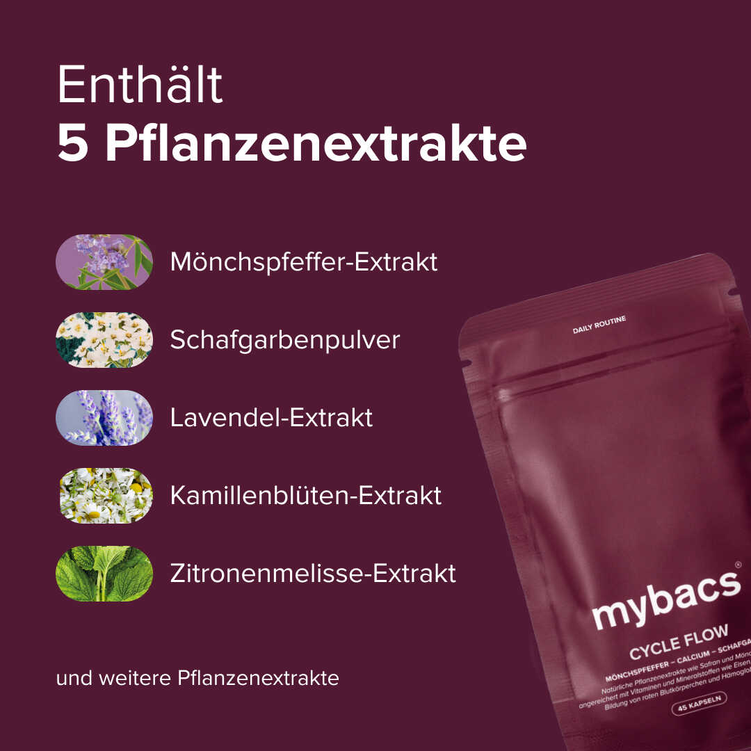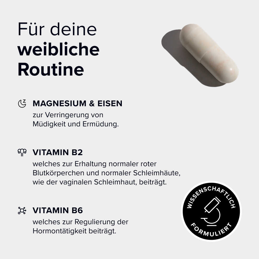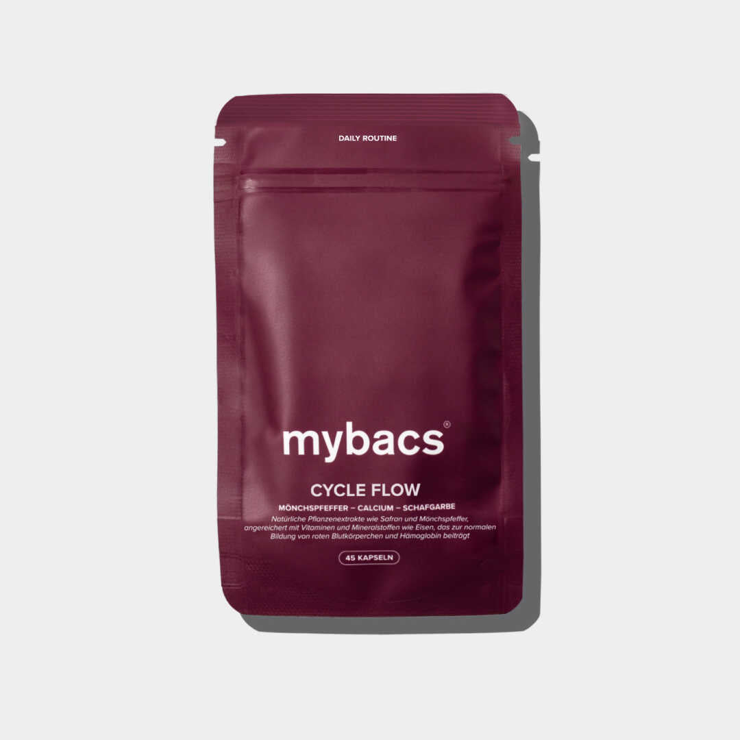 Cycle Flow enthält gezielt Eisen, welches zur normalen Bildung von roten Blutkörperchen und Hämoglobin beiträgt⁴. Zudem trägt Vitamin B2 zum Erhalt der roten Blutkörperchen und zum Erhalt der Schleimhäute, wie der vaginalen Schleimhaut, bei⁷. Gerade während der Menstruation können diese Vitamine und Mineralien ergänzend sinnvoll sein, um den Körper optimal zu begleiten.