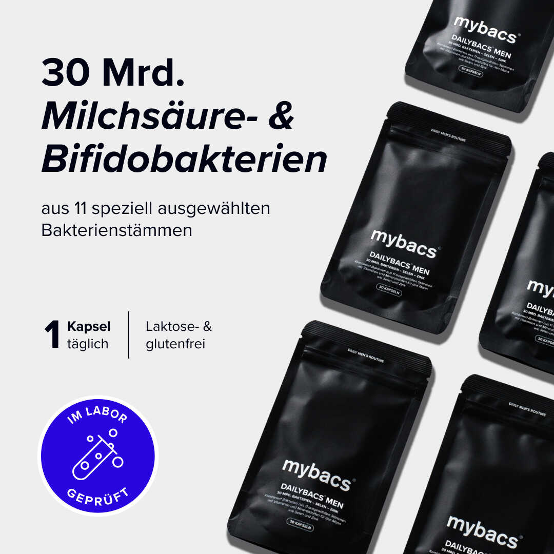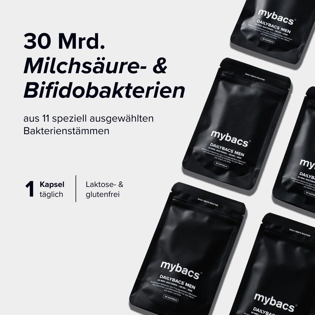 Die Dailybacs® Men sind eine Option für Männer, die ihre tägliche Ernährung auf unkomplizierte Weise mit einer Kombination aus Bakterienkulturen, Pflanzenextrakten, Ballaststoffen, Vitaminen und Mineralstoffen ergänzen möchten.