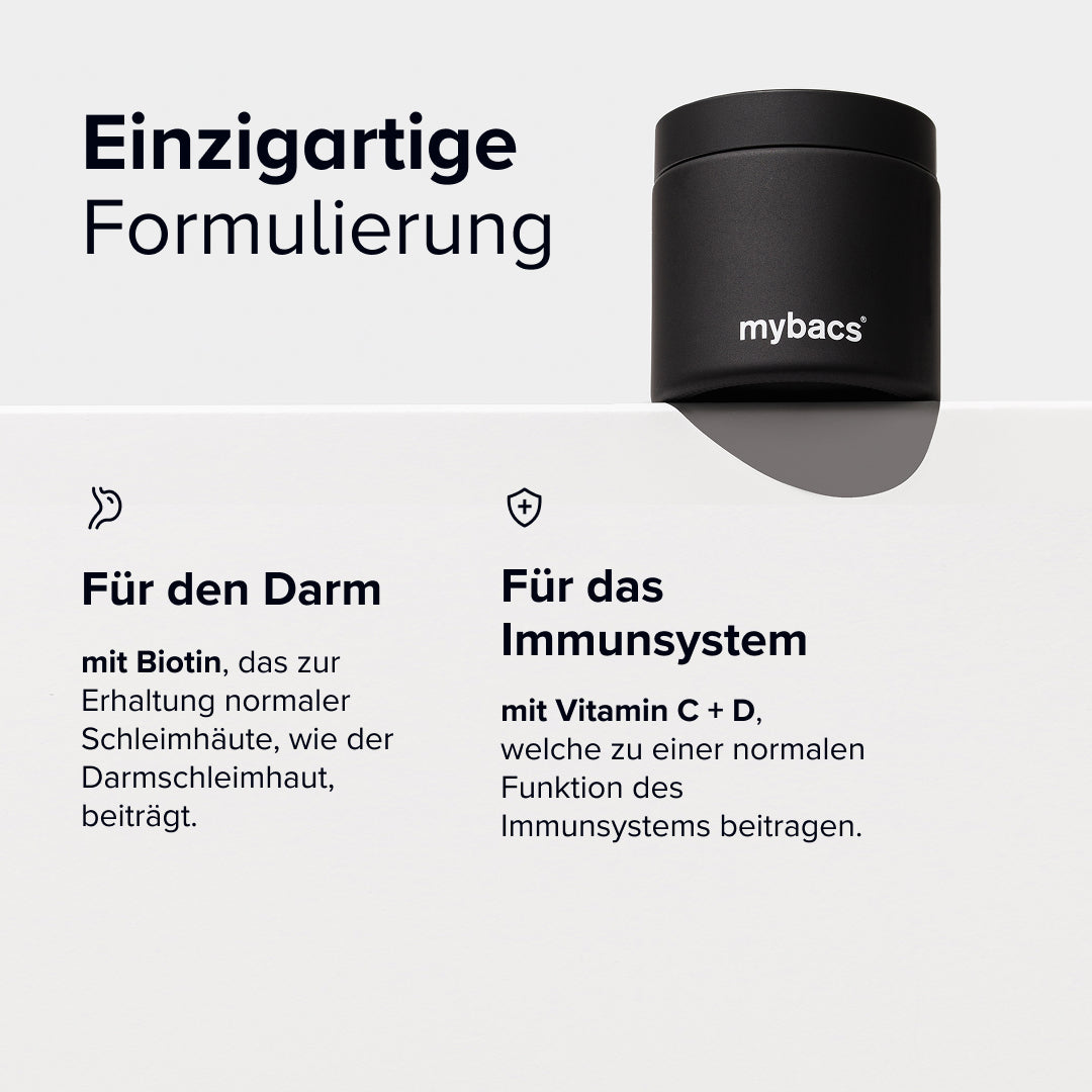 Mit Biotin zur Erhaltung normaler Schleimhäute wie der Darmschleimhaut¹. Außerdem wird durch eine regelmäßige Einnahme der Dailybacs® Men eine hohe Anzahl⁵ an aktiven Bakterienstämmen deinem Darmmikrobiom hinzugefügt.