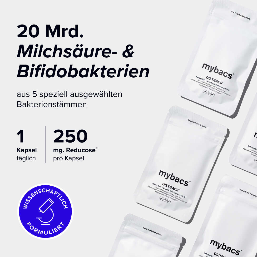 Dietbacs® ist ideal für Personen geeignet, die bewusst ihre Ernährung ergänzen möchten. Die Formulierung enthält 20 Mrd. Bakterien, den innovativen Markenrohstoff Reducose® (aus dem weißen Maulbeerblattextrakt), Bitterorangen-Extrakt und Inulin. Ergänzt wird die Formulierung durch Chrom, das zur Aufrechterhaltung eines normalen Blutzuckerspiegels beiträgt.