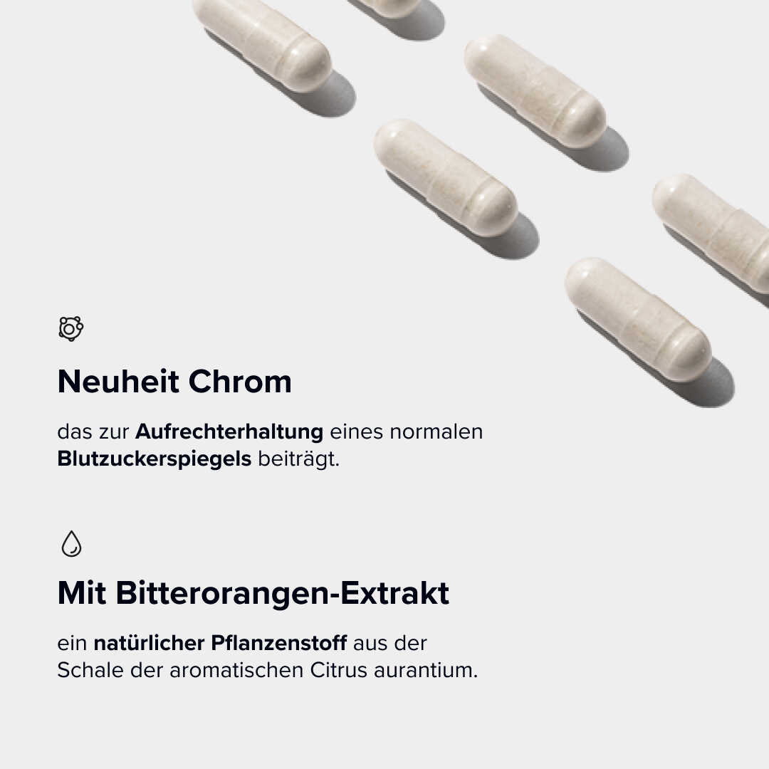 Neue Formulierung mit Chrom: Ein Spurenelement, welches zur Aufrechterhaltung eines normalen Blutzuckerspiegels beiträgt.
